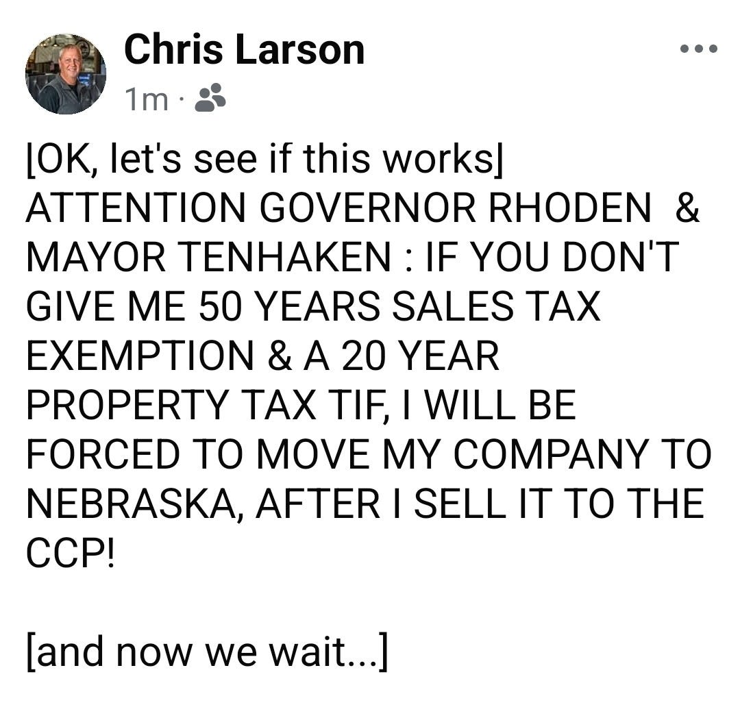 To briefly recap the latest SUPER EXCITING NEWS from superstar duo Larry Rhoden (unelected) & Paul Tenhaken (lame duck), who seem to have a fetish for giving our money to (sometimes foreign-owned) oligarchs: