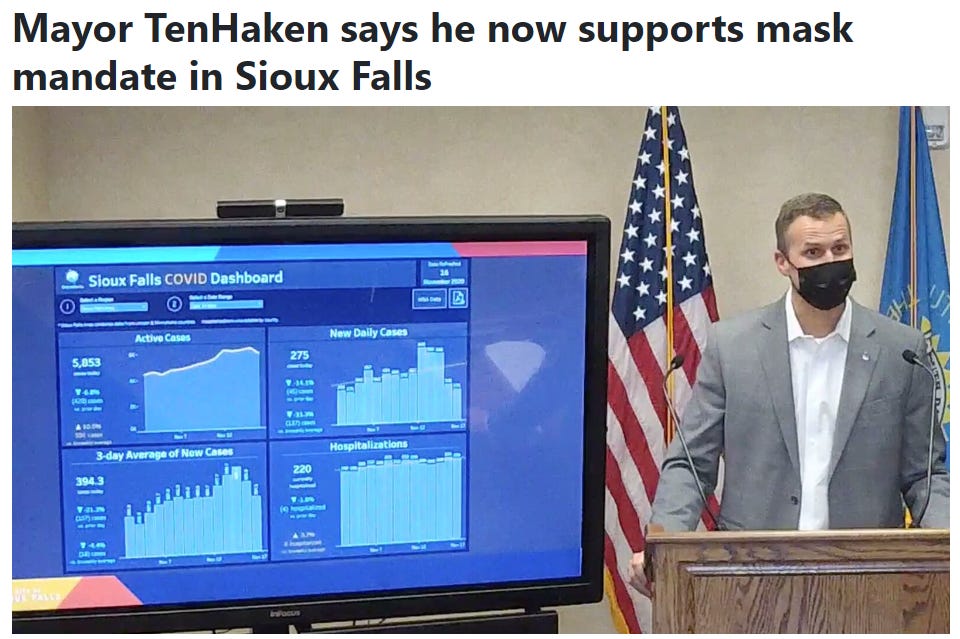 RINOs “trust the experts”. This applies not only to gov’t organizations such as the CDC and the OMB, but also to their fellow professional politicians (PP’s) who’ve managed to claw their way to the top, or middle, or wherever they happen to be lording their power over their constituents. During covid we saw this play out as Sioux Falls Mayor TenHaken eventually caved into the mask mandate zealots due to the pressure from Big Hospital. By the way, this happened all the way into NOVEMBER of 2020, a full six months after many of us came to the realization of what a joke that these mandates were in the real world. I mean, restaurants were told to make us wear them everywhere in their building EXCEPT for when we were sitting down! As a Sioux Falls business owner, I ignored this “mandate”, because it was stupid and there were no penalties for non-compliance. I do not recall any RINOs joining me in my dissident behavior. It is reasonable, I think, to acknowledge that the mayor was thrust into a “global pandemic” wargame that he clearly wasn’t prepared for (how could anyone be?) and that he had the best of intentions for keeping the peace in his town, while pointing out that by this point in the game most of these measures “recommended by the CDC” were obviously idiotic and counter-productive.